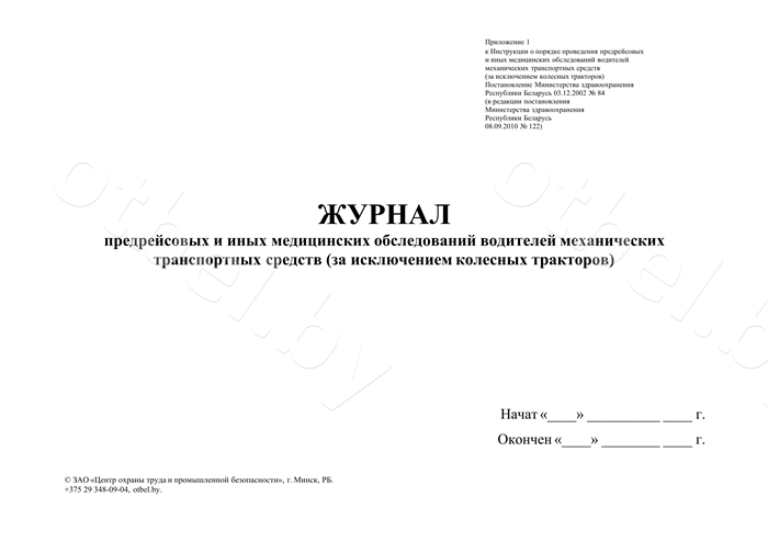 Инструкция о порядке проведения предрейсовых и иных медицинских обследований водителей механических транспортных средств (за исключением колесных тракторов), утверждена Постановлением Министерства здравоохранения Республики Беларусь № 84 от 03.12.2002 г.