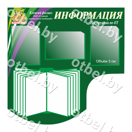 Основа – белый ПВХ, толщиной от 3мм (в зависимости от размера) без покрытия пленкой с полноцветным изображением. Любая надпись («Информация», «Для Вас», «Охрана труда», «Одно окно» и т.п.) вверху. В комментариях укажите цвет надписи