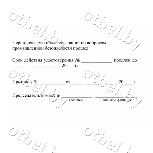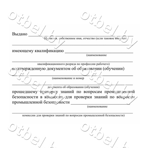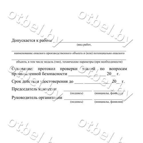 Удостоверение на право обслуживания потенциально опасных объектов, выполнено в соответствии с постановление Министерства по чрезвычайным ситуациям Республики Беларусь от 06.07.2016г. № 31 «О некоторых вопросах подготовки и проверки знаний по вопросам промышленной безопасности»